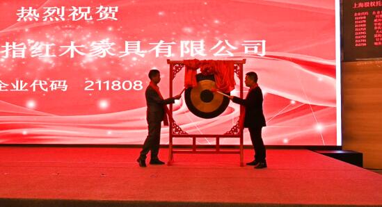 2021年4月21日,随着一阵挂牌锣声响起,经上海朗荣投资管理有限公司推荐, 成功推荐开化大拇指红木家具有限公司,企业代码: 211808登陆上海股权交易中心股权报价系统,顺利迈出与资本市场对接的第一步。企业领导人前来参加挂牌仪式。